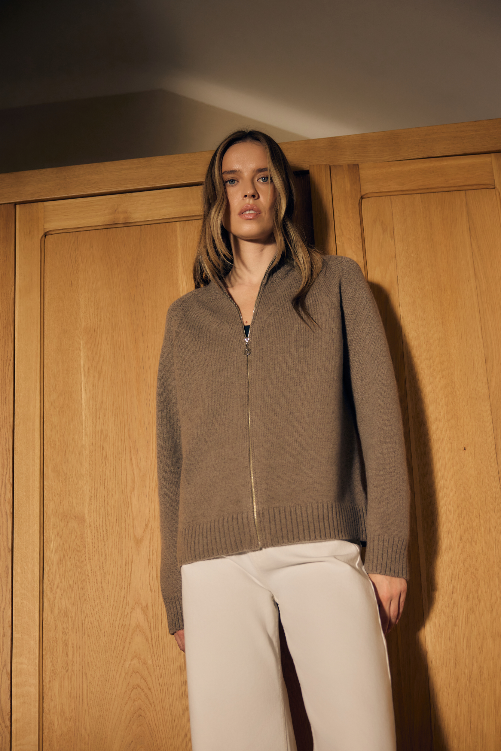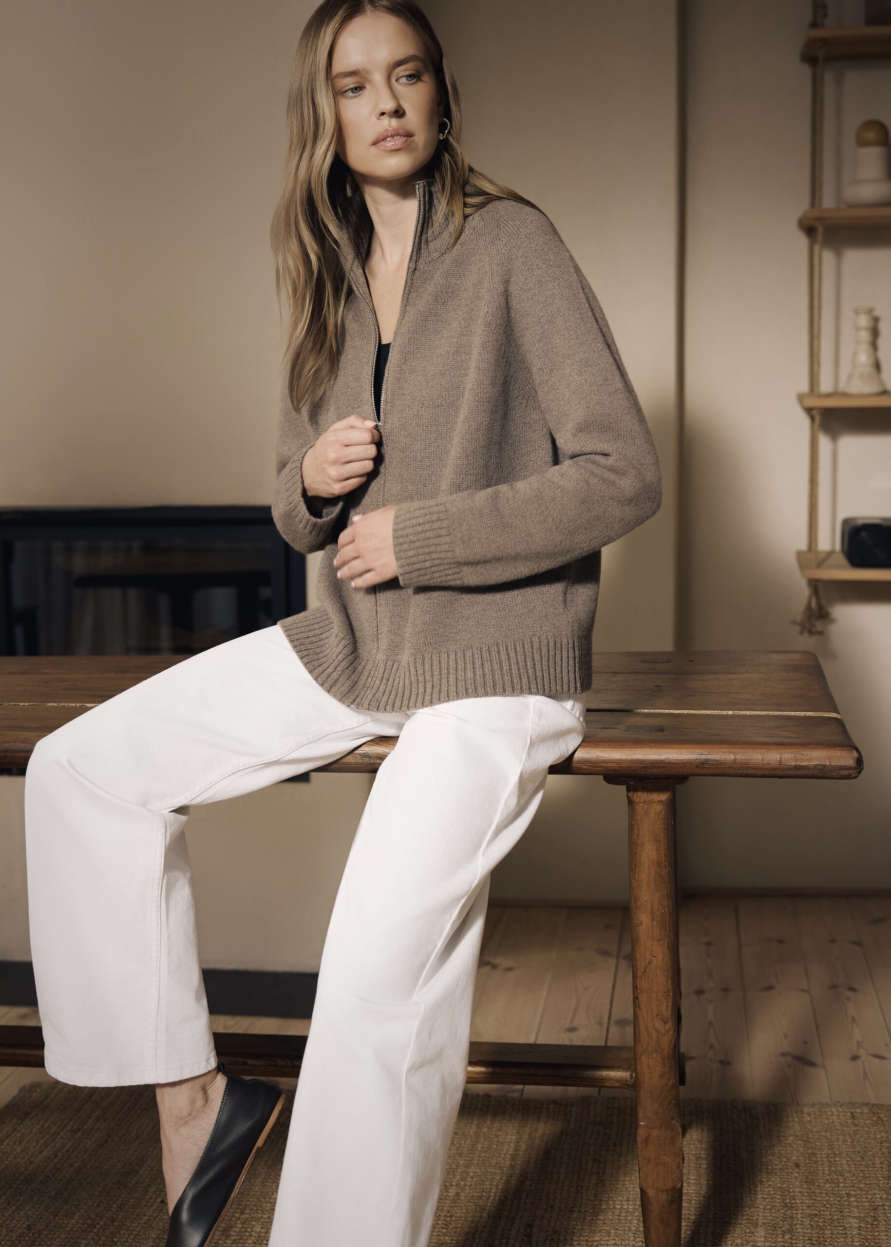 Rozpinany kawowy kardigan Alya wyróżnia się starannym wykończeniem – prążkowane mankiety na dole, przy rękawach i na kołnierzu dodają mu ciekawej struktury. Rozpinany na całej długości pozwala na różnorodne stylizacje – zapięty tworzy minimalistyczną, elegancką linię przypominającą golf, rozpięty układa się jak delikatny kołnierzyk. To damski kawowy kardigan, który łączy prostotę i szyk z przemyślaną funkcjonalnością. W Ether dbamy także o komfort – kawowy damski kardigan został uszyty w Polsce z najwyższej jakości włoskiej przędzy, wełny Merino Extrafine i kaszmiru. Zachwyca miękkością, trwałością i niesamowitym komfortem noszenia. To damski kawowy kardigan, który otula subtelnym ciepłem i pozostaje wierny idei ponadczasowej mody premium.