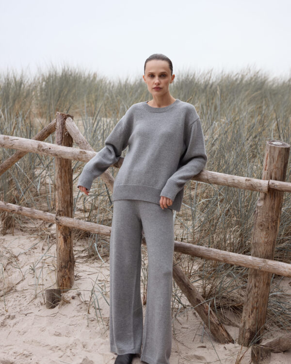 Kawowe spodnie z wełny Gemini wyróżnia prosta, szeroka nogawka. To modowy, ale niesamowicie uniwersalny fason, który gwarantuje swobodę ruchu. Delikatny mankiet na dole dodaje całości subtelnego wykończenia, podkreślając starannie przemyślany design. Minimalistyczny kawowy odcień prezentuje się niezwykle efektownie, a przy tym nigdy nie wychodzi z trendów. Szare spodnie z wełny i kaszmiru Gemini są idealne dla kobiet ceniących styl i komfort, oferując wszechstronność w stylizacji – to idealny element kobiecej garderoby kapsułowej.