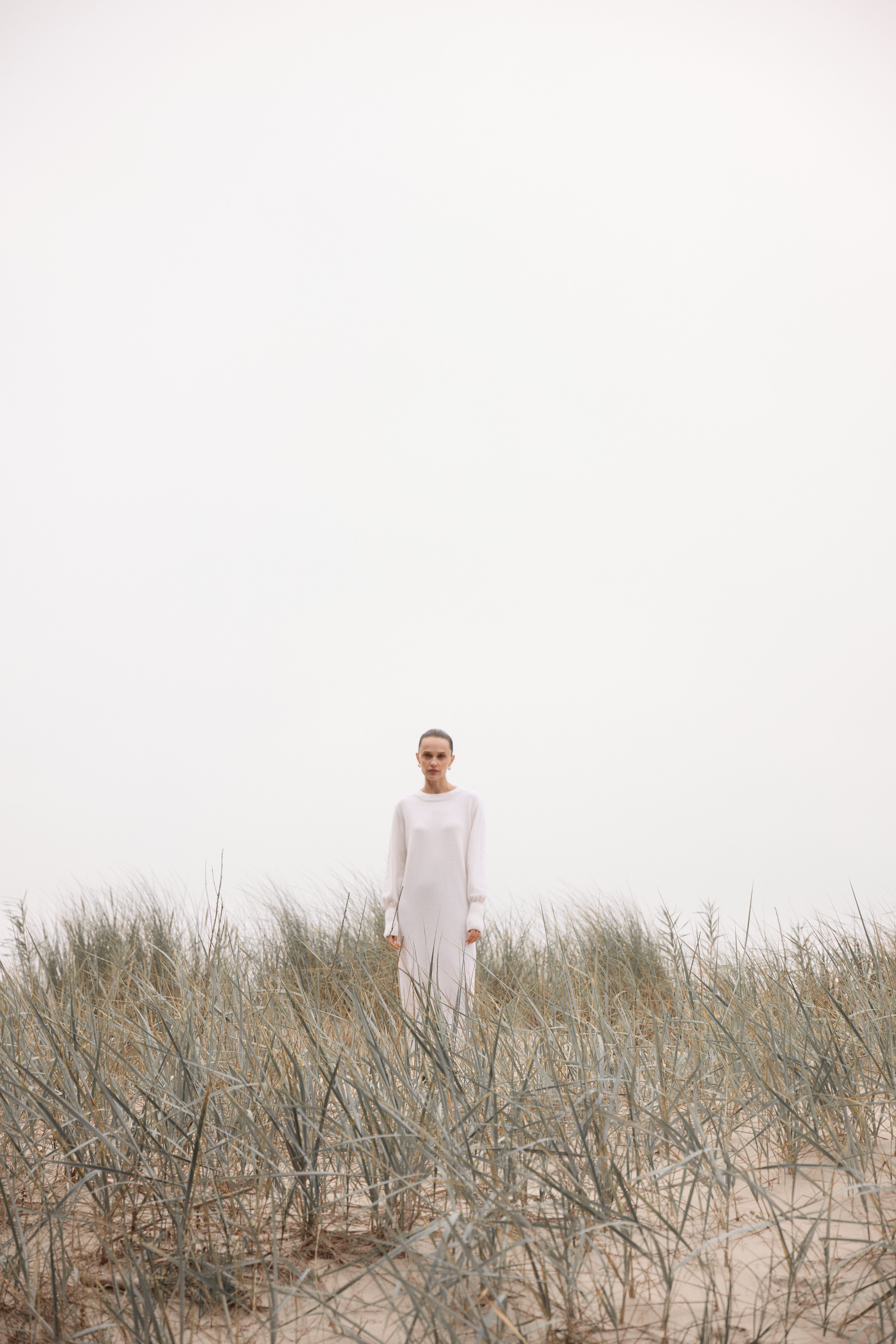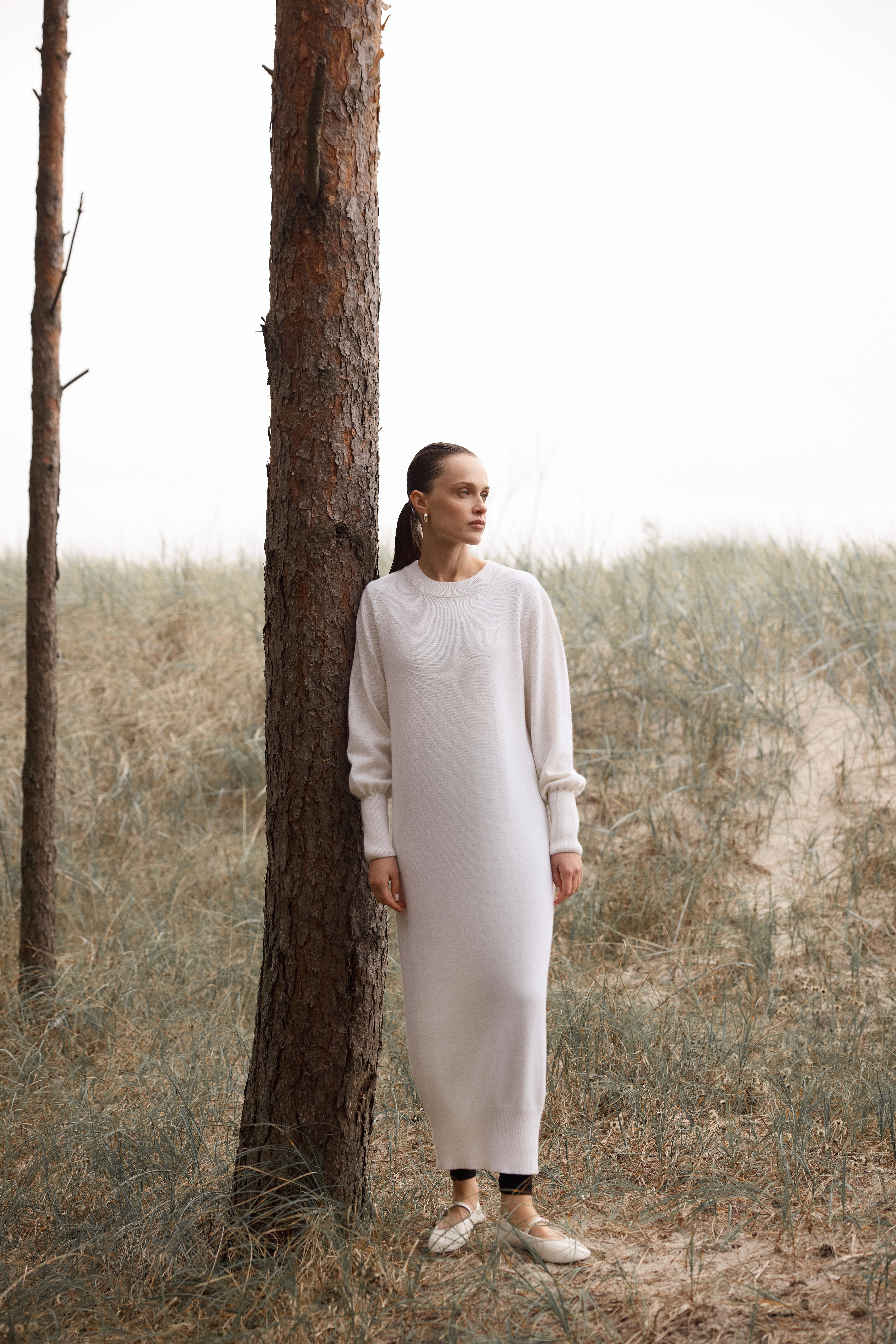 The Enif long wool dress by Ether is an elegant piece that combines exceptional aesthetics with wearing comfort. This milky maxi dress is crafted in Poland from the highest quality Italian yarn. The carefully chosen blend of Merino Extrafine wool and cashmere makes the cream long dress incredibly thick, soft, and pleasant to the touch.