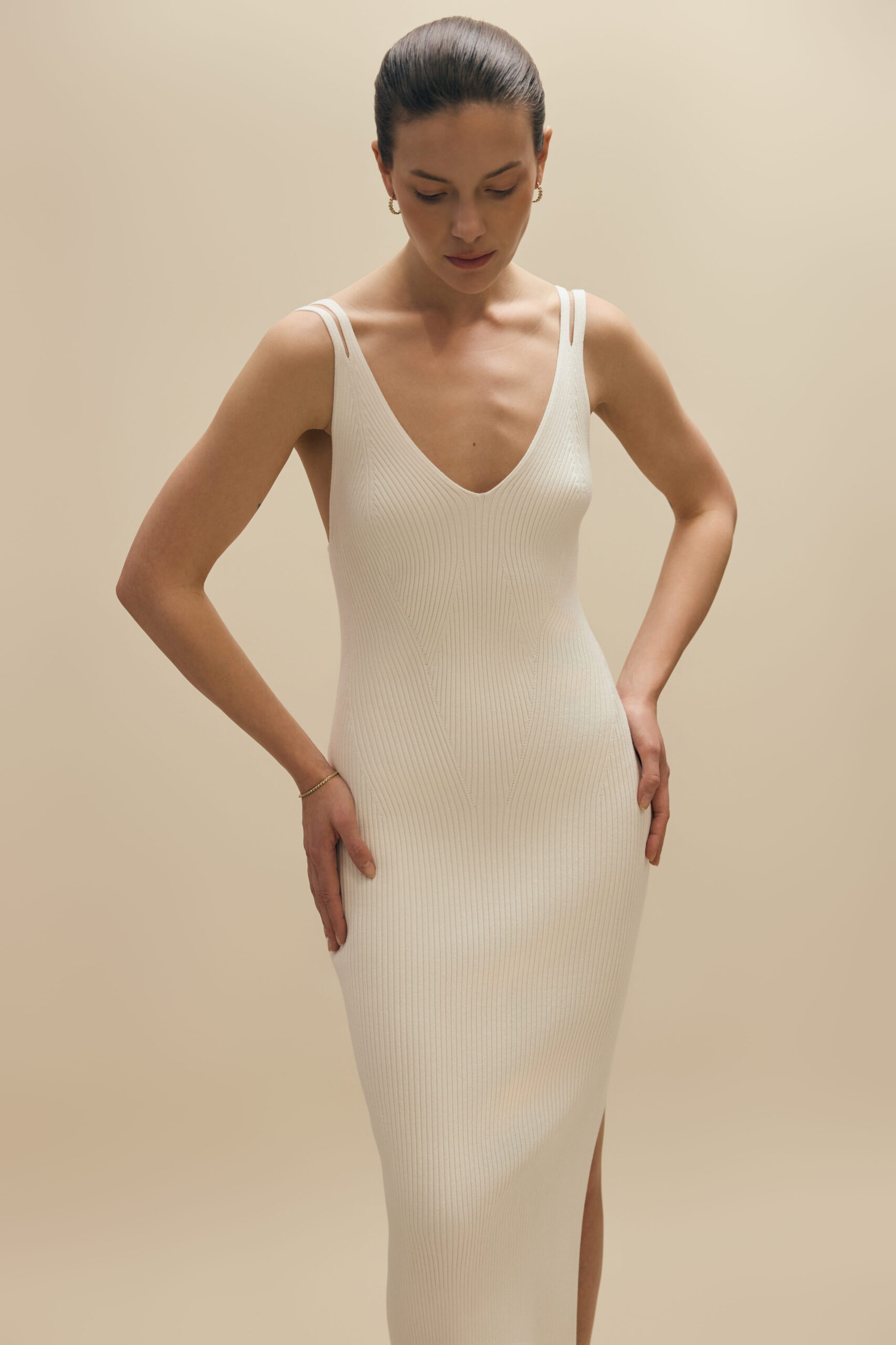 Once again at Ether, elegance meets minimalism and comfort. Milky midi dress on double straps is a symbol of timeless chic. The deep V neckline beautifully elongates the silhouette, and the back wonderfully exposes the back. The close-fitting cut, ribbed fabric, two thin shoulder straps and a striking opening give it femininity and sensuality. A milky midi dress with a deep V neckline is the perfect combination of delicacy and sophistication that will make you feel special.