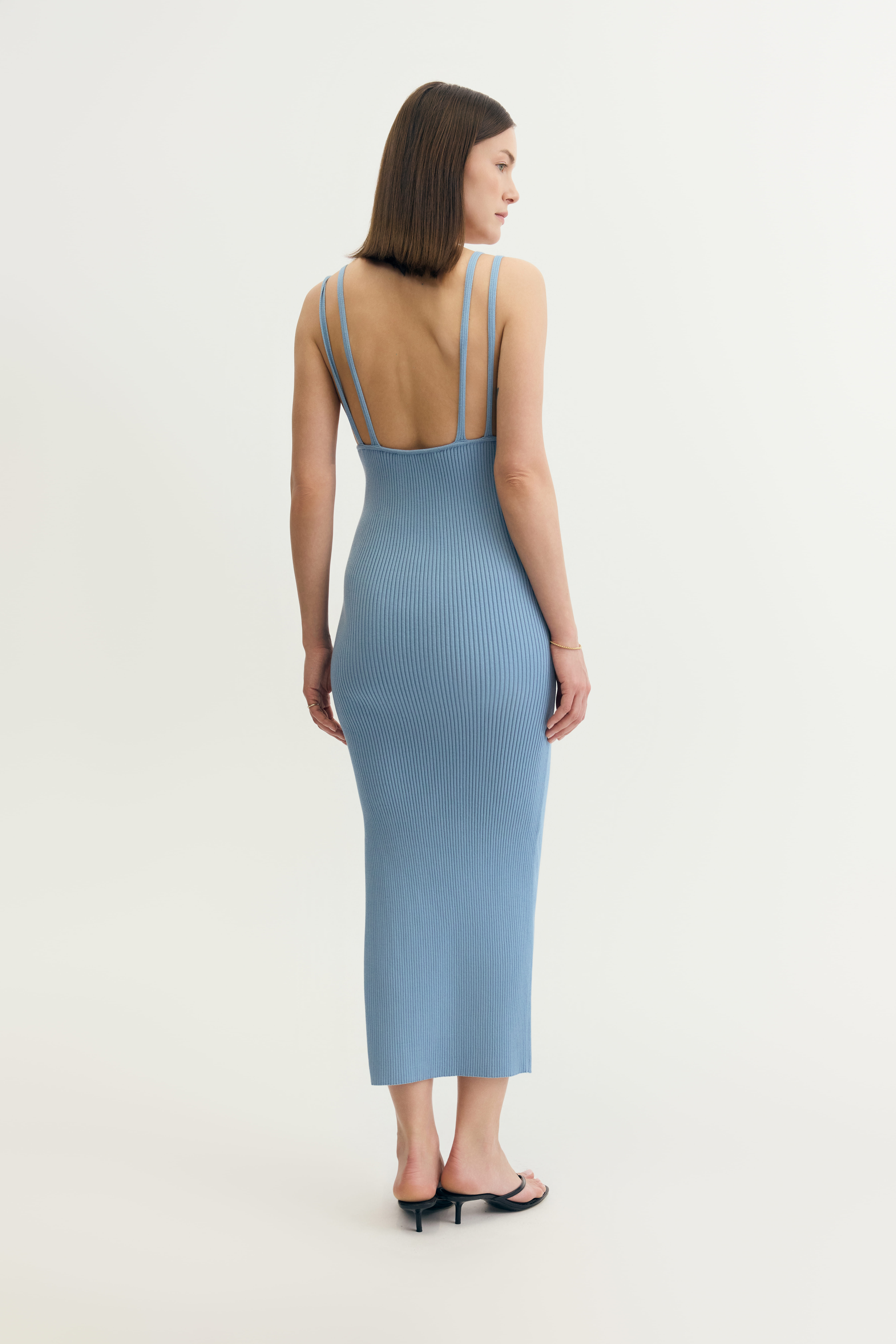 Blue midi dress with a deep V neckline is a combination of delicacy and freshness that will make you feel special. The delicate shade of blue adds to its freshness and subtlety. The midi length and ribbed fabric allow you to style the blue dress in many ways, both for everyday wear and for more formal occasions. The V-shaped neckline is a pinch of delicate but sensual expression. The back beautifully emphasizes the back, and the striking opening exudes femininity. Two thin straps add lightness to the whole composition, creating a harmonious balance between classic and modern.