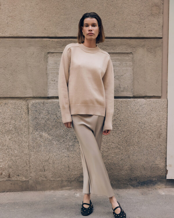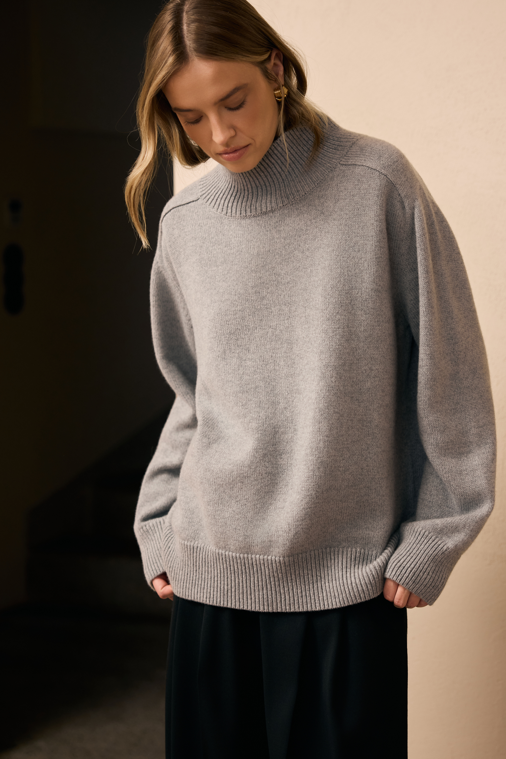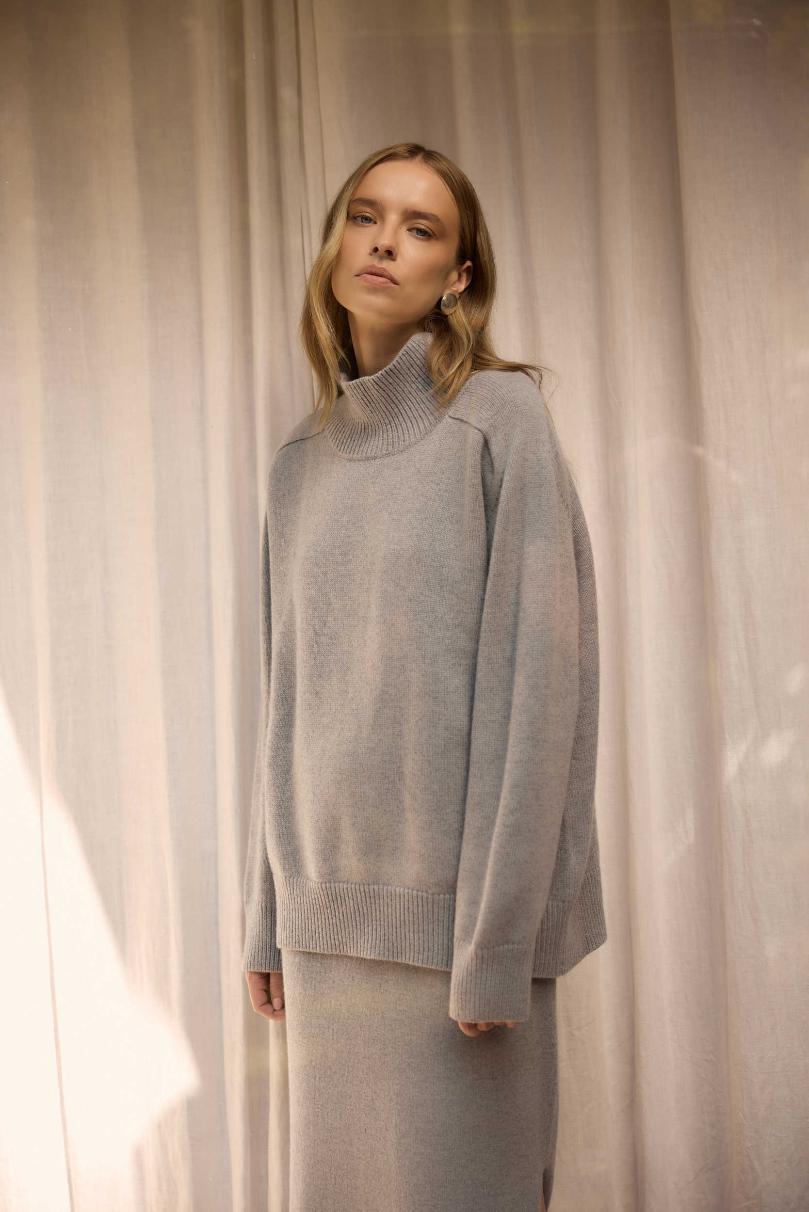 This Gray Turtleneck Sweater Libra is a perfect reflection of the values we follow at Ether. A combination of classic cuts, natural materials and a pinch of elegance. Grey turtleneck is distinguished by a slightly oversize cut, which is further emphasized by the lowered shoulder line. The sleeves, turtleneck and bottom of the sweater have been additionally finished with subtle ribbing, thanks to which the material fits wonderfully when worn.